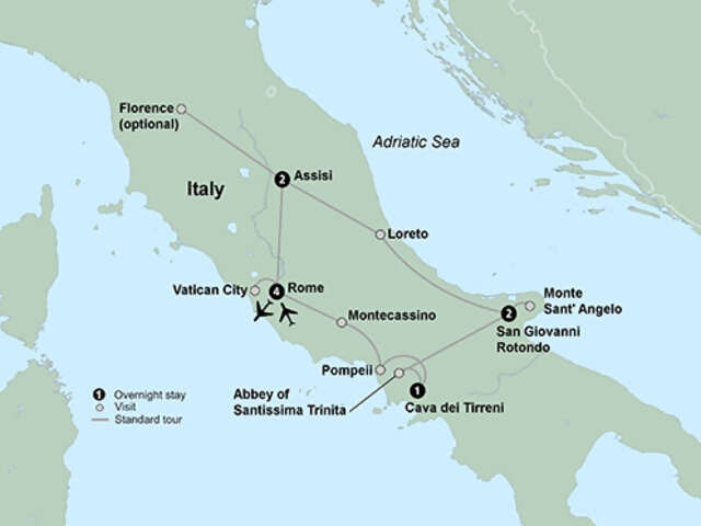 Join us on an inspirational journey through the rolling hills and lively cities of beautiful Italy. Attend the weekly papal audience and receive the blessing given by His Holiness, Pope Francis. Discover the incomparable splendor of the Sistine Chapel and St. Peter’s Basilica. Spend time at the Basilica of St. Francis in Assisi, the beloved saint’s hometown. Stay two nights in San Giovanni Rotondo, and pray in the church dedicated to St. Pio of Pietrelcina – “Padre Pio.” Reflect at the Grotto of Michael the Archangel, on the rugged Gargano Peninsula. Discover the Abbeys of Santissima Trinita and Montecassino. In the town of Pompeii, have time at the Madonna del Rosario Sanctuary, one of the most famous shrines of Christianity.