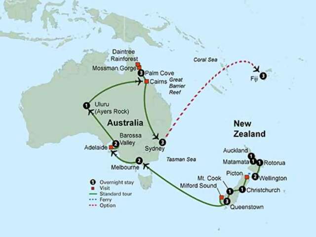 An epic experience awaits! Your journey begins on New Zealand’s picturesque North Island and ends in Australia’s energetic and modern city of Sydney. On this small group tour, one adventure follows another. Explore the Great Barrier Reef, cruise Milford Sound, travel to the Outback and visit Australia’s famous wine region, the Barossa Valley. That’s just the start. Stand before Uluru (Ayers Rock), gaze up at Mt. Cook and set sail on Sydney Harbour. Delve into the local culture during a home-stay on a working farm, a “Gourmet Icons” tour of Sydney, dinner on the Colonial Tramcar restaurant in Melbourne and visit Rotorua, the Maori capital of New Zealand. From start to finish you are sure to enjoy this unparalleled adventure.