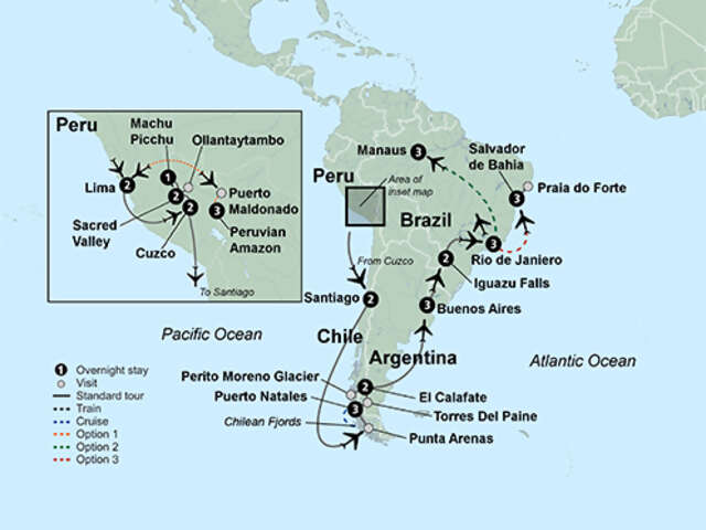 Experience a journey from the heights of Machu Picchu, through the stunning natural beauty of Patagonia, and into cosmopolitan Rio de Janeiro. In Peru, visit Lima, the Sacred Valley, Machu Picchu and Cuzco. Explore the cultured city of Santiago, Chile. In rugged Patagonia, take in the breathtaking sites at Torres Del Paine and Perito Moreno glacier in El Calafate. Experience an authentic tango in Buenos Aires. Discover the mighty Iguazu Falls. Enjoy breathtaking views of Rio from Christ the Redeemer statue. This is truly a trip of a lifetime across South America, one of the world’s most exciting and diverse destinations.