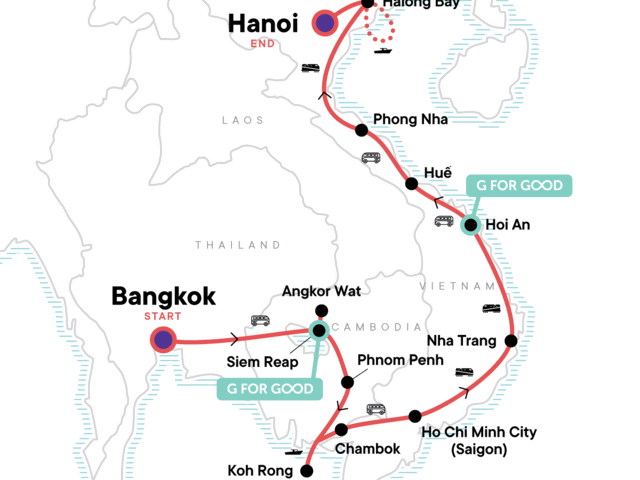 Your Big Night Out Moment: Reminisce Riverside, Hoi An. Halong Bay boat cruise with lunch. Orientation walks in Ho Chi Minh City, Hoi An, Hanoi, and Phnom Penh. Guided sunrise tour of Angkor Wat temple complex. Two street food crawls in different cities. All transport between destinations and to/from included activities.