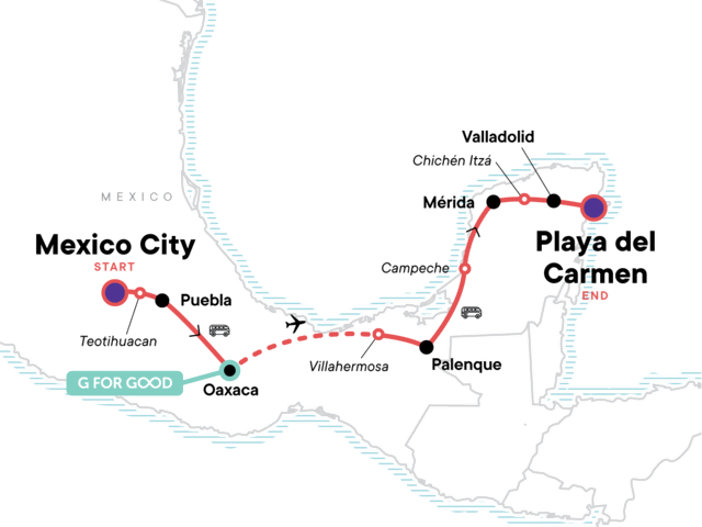 Your Discover Moment: Playa del Carmen. Guided tour of Teotihuacan. Orientation walk in Puebla. Orientation walk and market visit in Oaxaca. Guided tour of Palenque ruins site. Campeche visit. Orientation walk in Mérida. Guided tour of Chichén Itzá. Alebrijes Artisan Community Visit and G for Good Moment. Cooking demonstration with local expert in Oaxaca. Free time in Puebla, Oaxaca, and Playa del Carmen. Internal flight. All transport between destinations and to/from included activities.