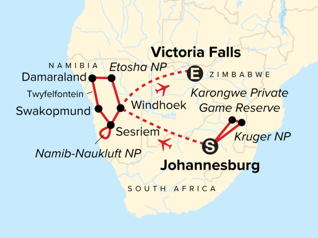Your Foodie Moment: Traditional South Africa Braai (Barbecue), Johannesburg. Arrival transfer. Panorama Route scenic drive with entrances. Kruger National Park and private nature reserve wildlife safari drives in open vehicles. Sossusvlei desert excursion. Desert excursion with a local. View the Twyfelfontein ancient petroglyphs. Full-day open-vehicle wildlife safari drive in Etosha. Tour of Victoria Falls. Internal flights. All transport between destinations and to/from included activities.