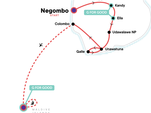 Your Welcome Moment: Welcome Moment - Meet Your CEO and Group. Spice plantation visit. Temple of the Tooth visit. Tea plantation visit. Cooking demonstration. Safari in Udawalawe National Park. Elephant Transit Home visit. Galle City and Fort tour. Seven days aboard a dhoni boat (Maldives). Fulidhoo Island visit and Bodu Beru performance. Felidhu Island visit. Bodu Mora Island visit. Snorkelling equipment. Beach time in the Maldives. Internal flight. All transport between destinations and to/from included activities.
