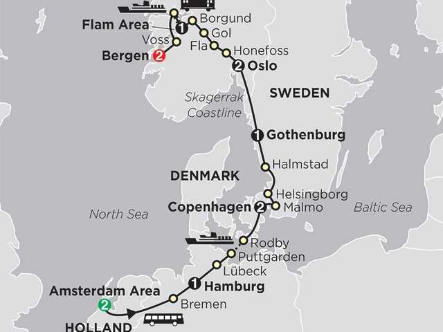 Follow in the footsteps of the Vikings as you explore many of northern Europe’s fascinating cities and scenic areas. This Scandinavia tour starts in Amsterdam with a canal cruise and ends in Bergen with guided sightseeing. Along the way, you’ll overnight in Hamburg, Copenhagen, Gothenburg, Oslo, and the Flam area.One of the Scandinavia tour highlights is a breathtaking ride on the Flam train, one of the world’s most scenic train rides, which passes through 20 tunnels and climbs to an elevation of 2,833 feet. Witness hypnotic waterfalls cascading down the side of steep, snowcapped mountains; rivers winding through deep gorges; farms on the side of steep slopes; and views of Sognefjord, Norway’s longest and deepest fjord. You’ll also take a scenic cruise on the Sognefjord with its majestic mountains, fresh mountain air, and small, idyllic villages dotting the landscape. Witness charming little fishing villages, rocky islands, and granite rocks along the scenic Skagerrak coastline from Gothenburg, Sweden’s second-largest city and one of Europe’s major seaports, to Oslo. Also enjoy the drive through Norway’s Hallingdal Valley with its splendid mountains, lakes, and rivers. Enjoy guided sightseeing in Amsterdam, Hamburg, Copenhagen, Oslo, and Bergen. Other tour highlights include seeing some UNESCO World Heritage Sites. In the German town of Bremen, a Hanseatic city with a history dating back 1,200 years and an important trading town in the 11th century, see the Town Hall, built between 1405 and 1410. Stop in the Hanseatic city of Lübeck, founded in 1143 on the Baltic Coast of northern Germany. In Bergen, see the Bryggen Hanseatic wharf with foundations dating to the 12th century. These are just a few of the many highlights of this value-minded tour to Scandinavia. Be sure to bring your camera to capture the beauty and wonderful memories.