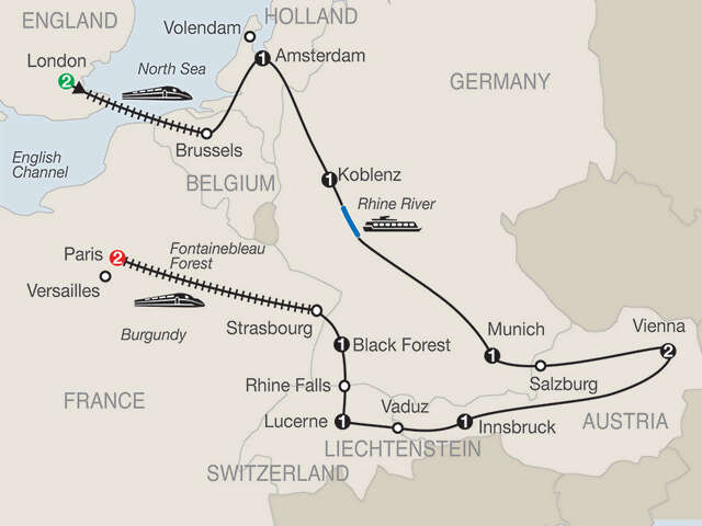 LONDON Guided sightseeing, visit St. Paul’s Cathedral and see the Changing of the Guard, if heldLONDON–BRUSSELS By high-speed Eurostar trainAMSTERDAM Canal cruiseRHINE CRUISEMUNICH Orientation, visit Marienplatz and [LF] the famous HofbräuhausSALZBURG Guided walking tour, visit Mirabell Gardens and Residenz Square VIENNA Guided sightseeing, visit Heldenplatz and Cathedral SquareINNSBRUCK [LF] Tyrolean horse-drawn carriage ride and a drink at the Stiftskeller; walk through the Old Town to the Golden roofVADUZ Stop in the capital of LiechtensteinLUCERNE Walking tour including the Lion Monument and the Chapel BridgeRHINE FALLSBLACK FOREST [LF] Enjoy dinner followed by traditional Black Forest CakeSTRASBOURG–PARIS By high-speed TGV train (first-class)PARIS Guided sightseeing, ascend the Eiffel TowerHeadsets throughout the tour