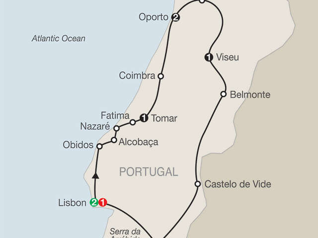 LISBONWelcome dinner; guided sightseeing, visit the Alfama quarter and Jeronimos Monastery; farewell dinner OBIDOSWalking tour of the medieval townALCOBAÇAVisit the Church of Santa Maria MonasteryNAZARÉLunch breakFATIMAVisit the Sanctuary of Our Lady of the RosaryTOMARVisit the Convent of ChristCOIMBRAVisit the University LibraryOPORTOGuided sightseeing, visit the Church of Sao Francisco and the Arabian Hall in the Stock ExchangeGUIMARAESWalk through the medieval centerQUINTA DA AVELEDAEnjoy [LF] Portuguese tapas with wine and explore its splendid gardensVISEUDinner at a local restaurantBELMONTEVisit the Jewish Museum; olive oil tastingCASTELO DE VIDEWalk through the Jewish quarterEVORAVisit a cork factory, guided walking tour, visit the gothic cathedral, the Sao Francisco Church, and the Ossuary Chapel