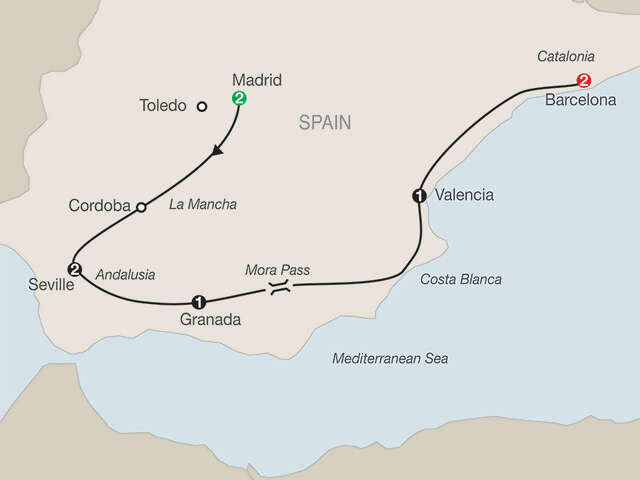 MADRIDWelcome dinner; guided sightseeing, visit the Prado MuseumCORDOBA OrientationSEVILLEGuided sightseeing, visit the Casa de Pilatos, and walk through the Santa Cruz quarterGRANADAGuided walking tour, visit the Alhambra complex and the Water Gardens of the GeneralifeVALENCIAOrientation driveBARCELONAGuided sightseeing, visit the Sagrada Familia Basilica; panoramic view from Montjuïc Hill; a delicious [LF] farewell dinner with Sangria at a local restaurant