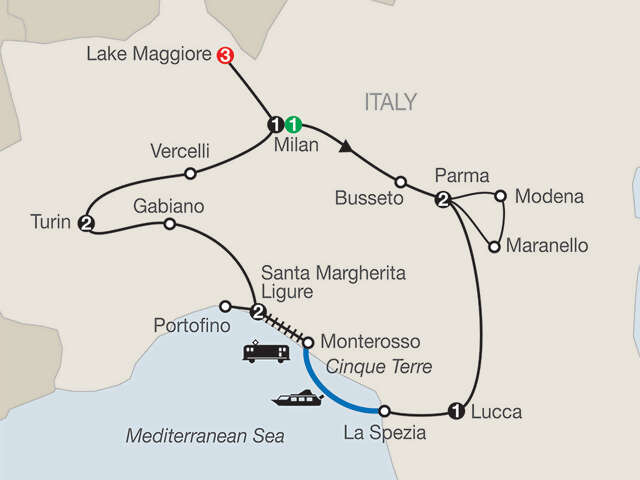 MILAN A special welcome dinner at local restaurant; guided walking tour, visit the Sforzesco Castle grounds and admire Duomo Square and the GalleriaBUSSETO See the birthplace of Verdi; [LF] parmesan cheese tasting at a local caseificioPARMA Guided sightseeingMODENA [LF] Balsamic vinegar tastingMARANELLO [LF] Visit the Ferrari GalleryLUCCA OrientationCINQUE TERRE By boat and trainSANTA MARGHERITA LIGURE Boat cruise to PortofinoGABIANO [LF] Wine tasting and lunchTURIN Guided sightseeing, admire the Mole Antonelliana, walk through the historic center, and visit the cathedral that houses the Holy ShroudVERCELLI[LF] Visit a rice factory and enjoy a risotto lunchLAKE MAGGIOREGuided sightseeing and boat ride to Isola Bella to visit the baroque palace and peacock gardens Headsets throughout the tour