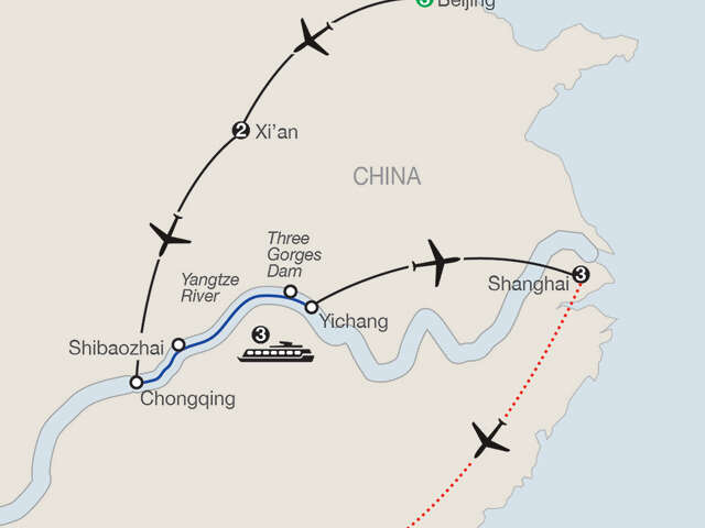 BEIJING Sightseeing with a Local Guide including headsets; visit Tian’anmen Square, the Forbidden City, Great Wall, and Temple of Heaven; [LF] hutong tour by rickshaw; [LF] Peking Duck welcome dinnerXI’AN Sightseeing with a Local Guide including headsets; visit the Terracotta Warriors and Dayan Pagoda; noodle-making demonstration; “Tang Dynasty” dinner show; calligraphy class CHONGQING Visit a local zoo to see pandasYANGTZE RIVER Three-night cruise through the Three Gorges including a walking tour in Shibaozhai, a boat excursion on Goddess Stream, and a tour of the Three Gorges dam siteSHANGHAI Sightseeing with a Local Guide including headsets; visit Yu Yuan Gardens, a silk factory, and the Shanghai Museum; [LF] xiaolongbao lunch; walking tour of the French Concession; farewell dinnerHONG KONGSightseeing with a Local Guide; take a cable-car up Victoria Peak; visit the dried seafood market; walking tour of the Mongkok neighborhood; travel on the Star Ferry & Double Decker Tram; Host service during your stay