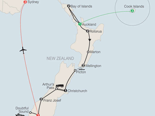 Experience the best of the Cook Islands, New Zealand, and Sydney on this unforgettable vacation filled with dramatic scenery, cultural exchanges, and top attractions. Start your vacation in the tropical Cook Islands with a sightseeing tour and plenty of leisure time to swim, snorkel, or relax on the beach.Then, you’ll experience some of New Zealand’s most majestic scenery throughout your tour. In the Bay of Islands, enjoy a scenic cruise to the iconic “Hole in the Rock.” In Rotorua, visit Te Puia to see New Zealand’s largest geyser and boiling mud pots. Continue south through New Zealand’s lush green North Island to Wellington and take a scenic inter-island ferry to New Zealand’s South Island. In Christchurch, board one of the world’s most scenic trains and travel across the Southern Alps. Two nights at Franz Josef won’t be enough as you admire the incredible views and have a chance to participate in a Glacier Valley walk. But that’s not all…you’ll enjoy an excursion to Fiordland National Park, boasting some of the world’s most breathtaking scenery, where you’ll have an unforgettable cruise on Doubtful Sound. It’s not just amazing scenery you’ll experience on this Cooks Islands, New Zealand, and Sydney tour. Throughout the tour, Globus has also included out-of-the-ordinary adventures to make your vacation unique. For example, visit a local farm and enjoy a barbecue lunch, enjoy a wine tasting and tour at a local winery in Queenstown, and join a local New Zealand family in Rotorua for dinner in their home. In the vibrant city of Sydney, enjoy a 3-night stay, a city sightseeing tour, and plenty of free time to explore on your own. From the tropical oasis of the Cook Islands to rugged and remote Doubtful Sound and cosmopolitan Sydney, it’s a vacation of a lifetime!