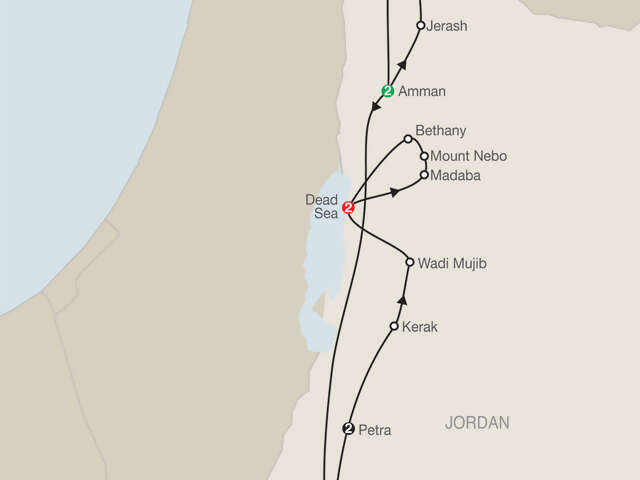 AMMAN Welcome dinner; guided sightseeing, visit the amphitheater; excursion to Jerash and Um QuaisWADI RUM Visit the largest wadi in Jordan and [LF] enjoy a four-wheel drive through the desertPETRA Guided sightseeing, including the Siq and the Treasury; [LF] sip tea in a Bedouin tentKERAK Visit the Crusader CastleWADI MUJIB Visit the Jordanian Grand CanyonMADABA Visit St. George’s Church and the Archaeological MuseumMOUNT NEBO Visit the mountain where Moses saw the Promised LandBETHANY BEYOND THE JORDAN Visit the site of John the Baptist’s settlement