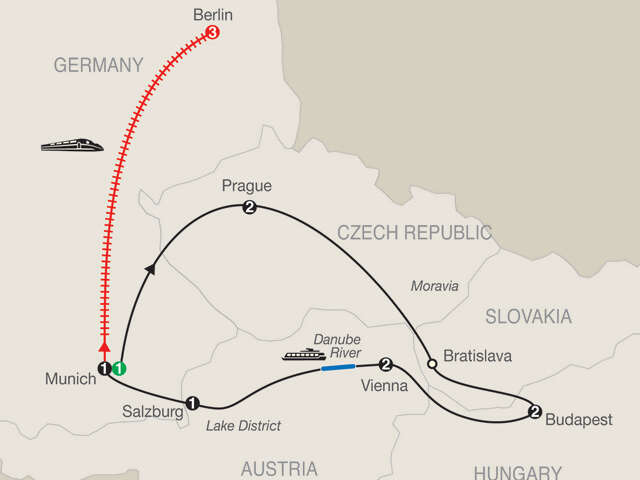 MUNICH Welcome dinner; orientation including Marienplatz; farewell dinnerPRAGUE Guided sightseeing, Astronomical Clock, visit the Hradcany Castle groundsBRATISLAVA [LF] Visit the capital of Slovakia and enjoy a special lunch at a local restaurantBUDAPEST Guided sightseeing, a panoramic view from Fishermen’s Bastion, visit Matthias Coronation ChurchVIENNA Guided sightseeing, visit St. Stephen’s CathedralDANUBE CRUISE [LF] (Departures April 12-October 4) Enjoy Kaffee und Kuchen (coffee and cake) on boardSALZBURG Guided sightseeing, visit Mirabell Gardens and St. Peter’s Churchyard; [LF] taste the traditional Mozartkugel and Doppler Konfekt; a special dinner with wine at a local restaurantMUNICH-BERLIN By high-speed TrainBERLIN Guided sightseeing of historic landmarks. Take pictures of Holocaust Memorial & Brandenburg GateHeadsets throughout the tour