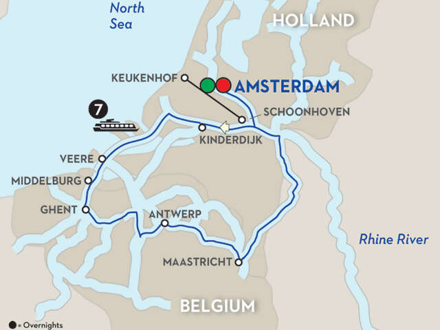 Cruise: deluxe 7-night cruise in an outside stateroom with hotel-style bedsDay 1 Amsterdam (Embarkation): welcome receptionDay 2 Schoonhoven. Excursion to Keukenhof–Kinderdijk: choice of full- or half-day visit to Keukenhof Gardens; visit a windmill at KinderdijkDay 3 Veere. Excursion to Delta Works & Middelburg: guided visit of the Delta Works; guided walk in MiddelburgDay 4 Ghent: guided sightseeing, visit St. Baaf’s CathedralDay 5 Antwerp: guided sightseeingDay 6 Maastricht: guided walkDay 7 Amsterdam: canal cruise; cheese tastingDay 8 Amsterdam (Disembarkation): your vacation ends this morning