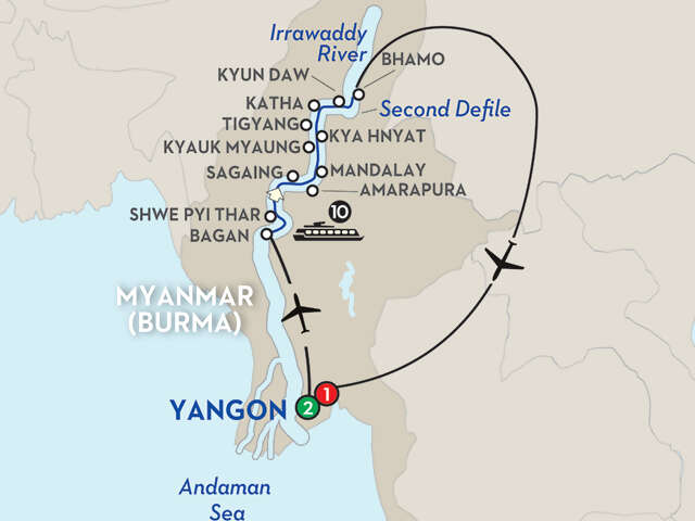 Cruise: deluxe 10-night cruise from Bagan to Bhamo in an outside suite with Avalon’s exclusive Comfort Collection BedsSM. Enjoy an intimate cruise experience with a maximum of 36 guests on board.Day 1 Arrive Yangon: welcome to MyanmarDay 2 Yangon: walking tour of the city’s landmarks; visit a local tea shop, Chaukhtatgyi, and Shwedagon Pagoda; welcome dinner in local restaurantDay 3 Yangon–Bagan (Embarkation): fly to Bagan; welcome reception with ship’s crew; traditional puppet showDay 4 Bagan: watch sunrise from temple; sightseeing including a local market, Shwezigon Pagoda, lacquer workshop, Ananda Temple, Dhammayangyi Temple, Sulamani Temple; oxcart ride to temple for sunsetDay 5 Shwe Pyi Thar: walking tour through this typical river village to visit a farmer’s home and see palm candy being madeDay 6 Sagaing–Amarapura: visit Kaunghmudaw Pagoda, a silversmith workshop and Soon U Ponya Shin Pagoda in Sagaing; visit U Bein Bridge and take a sampan ride at sunset in AmarapuraDay 7 Mandalay: sightseeing including Mahamuni, Kuthadaw and Shwenandaw Pagodas; visit tapestry, woodcarving, and gold leaf workshops; traditional dance performanceDay 8 Kyauk Myaung: walking tour through a pottery-making villageDay 9 Kya Hnyat: visit a monastery and present alms to the monks and see their lunch ritualDay 10 Tigyang: walking tour through village and walk to hilltop pagodaDay 11 Katha: visit to local market; excursion to elephant camp with elephant rideDay 12 Kyun Daw–Second Defile: visit a fisherman’s home, local school, and nunnery in Kyun Daw; cruise through the dramatic second defileDay 13 Bhamo (Disembarkation)–Yangon: explore Bhamo by trishaw and foot; fly to YangonDay 14 Yangon: end of vacation