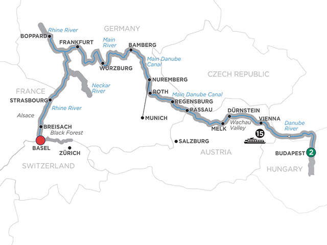 Day 1 Budapest: welcome to Budapest! Day 2 Budapest: guided tour, see Heroes’ SquareDay 3 Budapest (Embarkation): full day golf excursion, onboard welcome receptionDay 4 Budapest—Vienna: cruising or full day golf excursionDay 5 Vienna: guided sightseeing Day 6 Dürnstein—Wachau Valley—Melk: choice of guided tour, or hike up to the castle ruins in Dürnstein; scenic cruise through the Wachau Valley; guided tour of the Benedictine Abbey in Melk; wine tasting on boardDay 7 Passau: guided walkDay 8 Regensburg: guided walk; beer tasting on board, or full day golf excursionDay 9 Nuremberg: choice of guided sightseeing, or Nuremberg Rally Grounds tour, or Roth sightseeingDay 10 Nuremberg—Munich excursion: full day guided tour in Munich Day 11 Bamberg: guided tour, see the Old Town Hall Day 12 Würzburg: guided tour, visit to the Bishop’s Residenz Day 13 Main River Village: guided tourDay 14 Frankfurt. Excursion to Seligenstadt: choice of guided tour in Frankfurt, or guided tour in SeligenstadtDay 15 Boppard—Rhine Gorge—Rüdesheim: time at leisure in Boppard; scenic cruise through the Rhine Gorge; visit to Siegfried’s Mechanical Musical Instrument Museum in Rüdesheim; special treat Day 16 Strasbourg: guided tour, visit to La Petite France district and the gothic cathedralDay 17 Breisach. Excursion to Black Forest: choice of excursion to Black Forest, or guided tour in ColmarDay 18 Basel: your vacation ends this morning