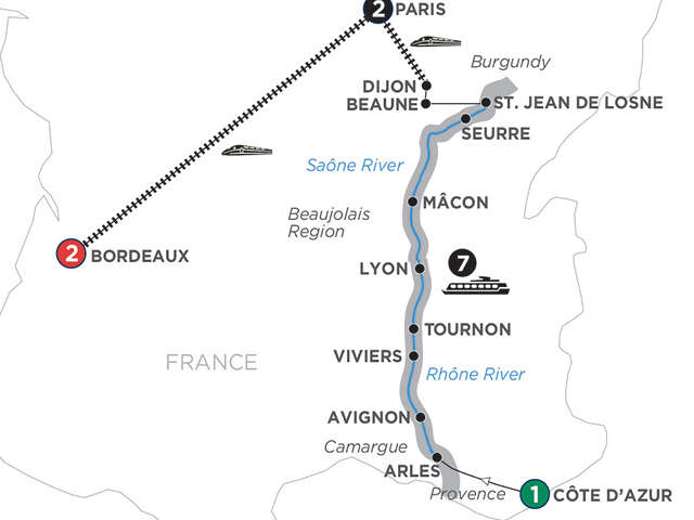 Day 1 Côte d’Azur: welcome to FranceDay 2 Côte d’Azur–Transfer to Arles (Embarkation): onboard welcome reception; scenic cruising in the Camargue region (daylight permitting)Day 3 Arles: guided sightseeing, visit the Roman AmphitheatreDay 4 Avignon: guided sightseeing, visit Palace of the Popes; guided tour to Châteauneuf du PapeDay 5 Cruising–Viviers: onboard lecture; guided walk, visit the Old Town and the cathedralDay 6 Tournon/Tain l’Hermitage–Vienne: guided walk in Tournon; onboard chocolate and wine tasting; guided walk in Vienne; onboard food & wine pairing dinnerDay 7 Lyon: guided sightseeing, picture stop on Fourvière Hill; guided tour to BeaujolaisDay 8 Cruising–St. Jean de Losne: Chardonnay excursion; wine & cheese tasting on boardDay 9 St. Jean de Losne (Disembarkation)–Beaune–Dijon–Paris: choice of visit the Hôtel-Dieu in Beaune or visit a wine cellar; TGV train from Dijon to ParisDay 10 Paris: choice of guided sightseeing or “Heart of Paris” walk, visit Notre Dame CathedralDay 11 Paris-Bordeaux: take a TGV train to Bordeaux; guided sightseeingDay 12 Bordeaux: St.Emillion area full day excursionDay 13 Bordeaux: your vacation ends this morning