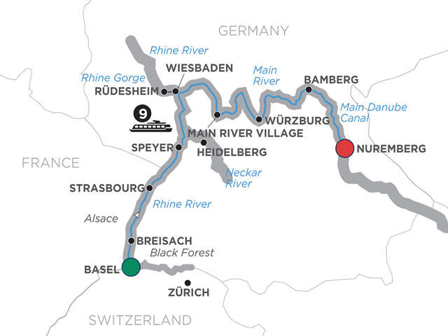 On this Christmastime river cruise, you’ll start in Switzerland, and cruise through the heart of Germany, with a stop in Strasbourg, France. Explore many unique Christmas markets, where you can shop for locally crafted gifts, smell the aroma of freshly baked gingerbread, and sample tasty holiday treats.Embark your river cruise ship in Basel, Switzerland, and sail to Breisach, Germany. From here, enjoy a visit to Germany’s Black Forest, known for contributing Black Forest ham, cherry cake, and cuckoo clocks to the world. In Strasbourg, France, visit the red-sandstone gothic cathedral with its ancient murals and fascinating astronomical clock. This time of year, the historic charm of the city is mixed with festive aromas, sights, and sounds—creating a truly magical atmosphere! In Heidelberg, Germany, visit the imposing ruins of Heidelberg Castle. To celebrate the season, you’ll find an ice rink at the foot of the castle and the Christmas market covers five town squares with an array of seasonal crafts and delicacies. An excursion takes you to charming Rüdesheim on the Rhine River, where you’ll see Europe’s largest nativity scene with life-size figures. In Würzburg, walk through the halls of the ornate Bishop’s Residenz—then stroll through the Christmas markets while you sip Glühwein (hot mulled wine). Learn about holiday traditions as you sail to Bamberg, a UNESCO World Heritage Site, where you’ll find nativity scenes built by local citizens throughout the town.Your Christmastime river cruise vacation ends in thousand-year-old Nuremberg. Marvel at the city’s medieval fortifications and gothic churches during your guided tour, and of course visit the Christmas market—one of the oldest in Germany. Be sure to try Lebkuchen (spicy gingerbread) and a traditional hot sausage. This festive river cruise is a unique and memorable way to experience the holidays!