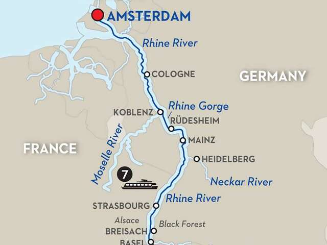 Day 1 Zürich–Transfer to Basel (Embarkation): onboard welcome receptionDay 2 Breisach. Excursion to the Black Forest: visit a woodcarver’s workshop; Christmas marketDay 3 Strasbourg: guided sightseeing, visit La Petite France district and the gothic cathedral; Christmas marketDay 4 Excursion to Heidelberg–Mainz: guided visit of the castle, see the Great Vat in Heidelberg; Christmas market; visit the Gutenberg Museum in Mainz; Christmas marketDay 5 Rüdesheim–Rhine Gorge: visit Siegfried’s Mechanical Musical Instrument Museum in Rüdesheim and enjoy a special treat; Christmas market; cruise through the Rhine GorgeDay 6 Cologne: guided city walk; Christmas marketDay 7 Amsterdam: canal cruiseDay 8 Amsterdam (Disembarkation): your vacation ends this morning