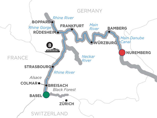 Day 1 Basel (Embarkation): onboard welcome reception Day 2 Breisach. Excursion to Black Forest: choice of excursion to Black Forest, or guided tour in Colmar Day 3 Strasbourg: guided tour, visit to La Petite France district and the gothic cathedral, local beer tasting; onboard beer lectureDay 4 Rüdesheim–Rhine Gorge–Boppard: choice of visit to Siegfried’s Mechanical Musical Instrument Museum, or cable car ride to the Niederwald Monument in Rüdesheim; special treat; scenic cruising through the Rhine Gorge; time at leisure in BoppardDay 5 Frankfurt: onboard beer tasting; choice of guided tour in Frankfurt, or guided tour in SeligenstadtDay 6 Main River Village: guided walking tour, onboard food and beer pairing dinner Day 7 Würzburg: guided tour, visit to the Bishop’s Residenz, taste a local beerDay 8 Bamberg: guided tour, see the Old Town Hall; visit a malt factory or a hop gardenDay 9 Nuremberg (Disembarkation): your vacation ends this morning