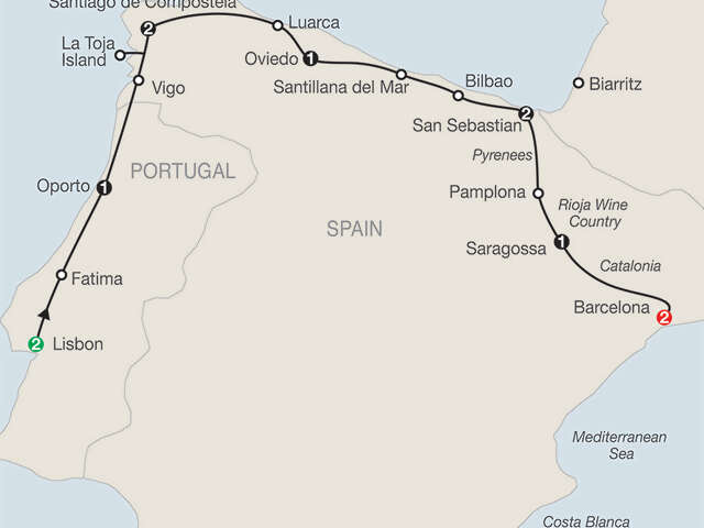 LISBON Welcome dinner; guided sightseeing, visit the Alfama quarter and Jeronimos MonasteryFATIMA Visit the Sanctuary of Our Lady of the RosaryOPORTO Guided sightseeing, visit the Church of Sao Francisco and the Arabian Hall in the Stock Exchange; [LF] Port wine tasting at Sandeman & CoVIGO Walking tourLA TOJA ISLAND [LF] Enjoy a coffee and the spectacular view at the Gran Hotel La Toja and admire the shell-covered churchSANTIAGO DE COMPOSTELA Dinner with wine at a local restaurant; guided sightseeing, visit the cathedral LUARCA Stop in this pretty fishing village with its white housesOVIEDO Guided sightseeing, visit the Cathedral of San Salvador and [LF] the Cámara Santa de OviedoSANTILLANA DEL MAR [LF] Visit the Altamira Neo CaveBILBAO Guided visit of the Guggenheim MuseumSAN SEBASTIAN Guided walking tour of the Old QuarterPAMPLONA [LF] Walk through the Calle Estafeta, followed by lunch with traditional tapas and Rioja wine at Basaburua restaurantSARAGOSSA Visit Plaza de PilarBARCELONA Guided sightseeing; visit the Sagrada Familia Basilica, panoramic view from Montjuïc Hill; farewell dinner at La Fonda del Port Olimpic restaurantHeadsets throughout the tour.